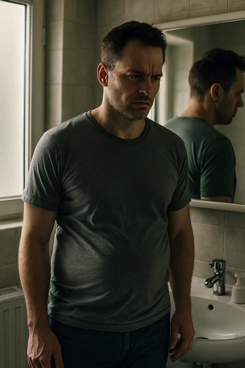 Not some grand revolution, just a regular guy, standing in his bathroom, staring at his reflection in yet another clingy t-shirt.
